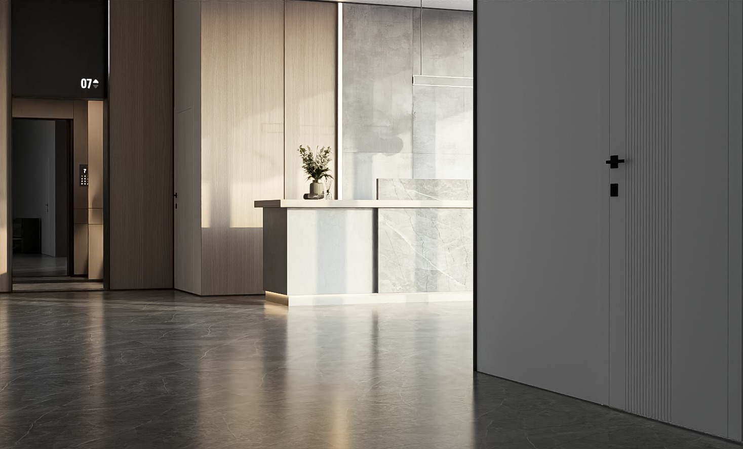 Ağ teksturalı panellər isə interyerə incəlik və təmizlik hissi qatır. Bu panellərin səthi yüngül naxışlarla işlənmiş, klinikanın zərif və səliqəli görünüşünü tamamlayır. Ağ rəngin gətirdiyi təmizlik və işıqlandırma effekti, klinikanın funksional və estetik tələblərini ideal şəkildə qarşılayır.