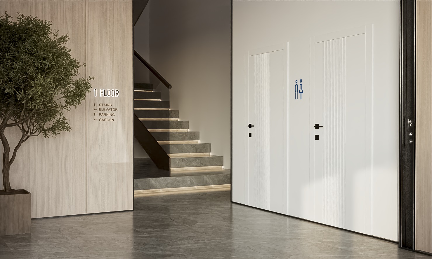 Məkanın əsas elementlərindən biri olan boz taxta materialları, həm estetik, həm də funksional baxımdan istifadə olunub. Təbii taxta detallar klinikanın isti və insan yönümlü simasını ortaya qoyur. Eyni zamanda, boz tonlarda olan taxta panellər müasir dizayn ilə təbiiliyi mükəmməl birləşdirir və məkanı həm peşəkar, həm də ev şəraitindəki rahatlığa yaxınlaşdırır.