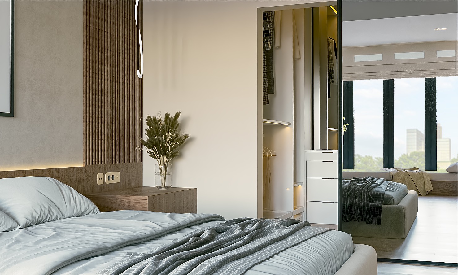 “Baku City Residences” yaşayış kompleksində mənzilin yataq otağı — rahatlıq və müasirliyin vəhdəti. Sadə və zərif dizayn, sakit pastel tonlar və yumşaq işıqlandırma ilə bəzədilmiş bu məkan istirahət üçün ideal sığınacaqdır. Minimalist mebellər və funksional tərtibat hər kvadratmetrindən maksimum istifadə etməyə imkan verir, eyni zamanda sakitlik və harmoniya yaradır. Təbiət elementlərinin incə toxunuşları, məsələn, ağac detallar və yumşaq teksturalar, otağa istilik və həyat verir. Burada hər detal sahibinin zövqünü və rahatlığını ön planda tutur — həqiqi ev rahatlığı üçün.