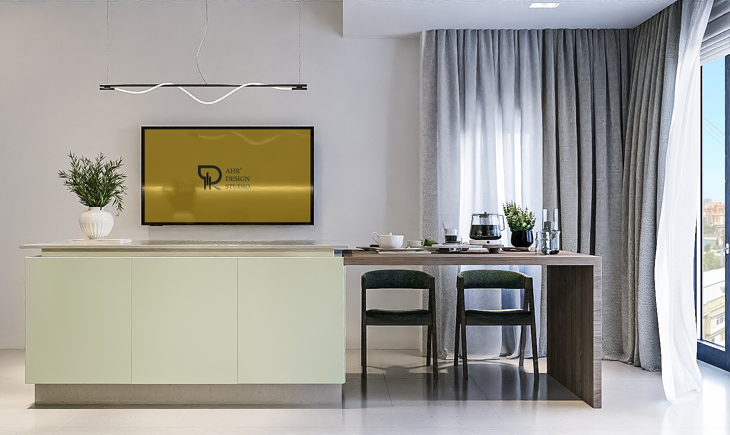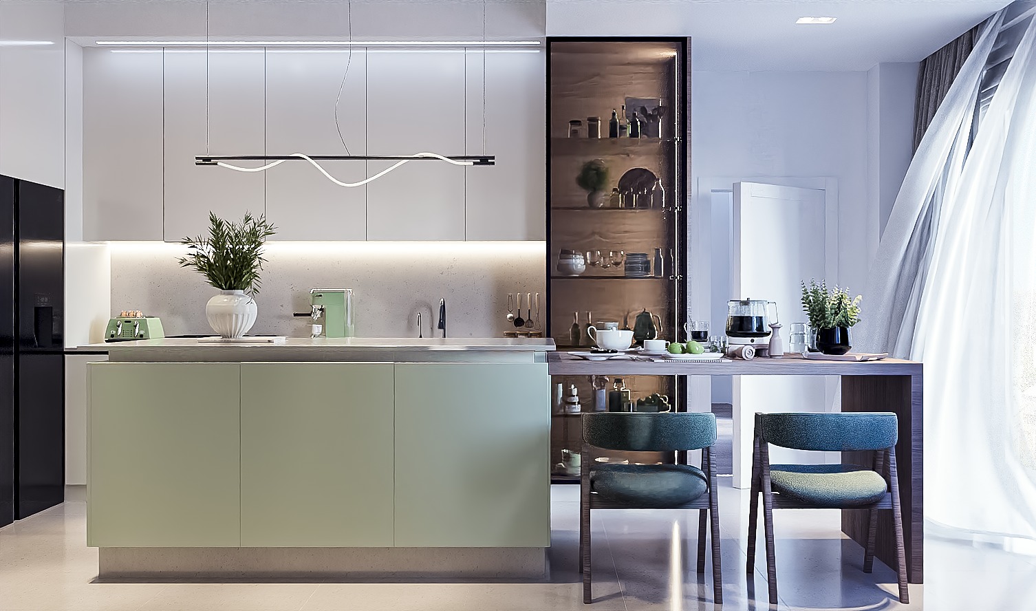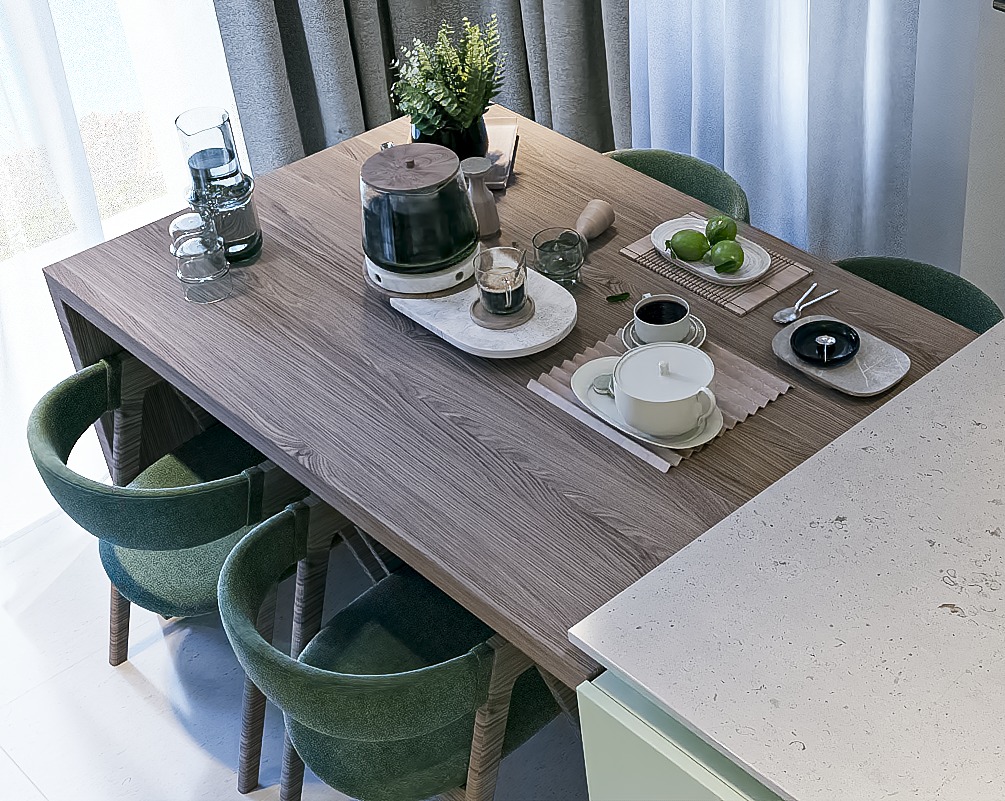 Müasir və minimal üslublu mətbəx interyeri. Burada pastel tonlar – xüsusilə açıq yaşıl və təbii taxta rənglərinin harmoniyası istifadə olunub. Məkanın əsas ideyası rahatlığı və funksionallığı qoruyaraq zərif və estetik bir ab-hava yaratmaqdır. Təbii materiallar: Masa və stulların təbii ağacdan hazırlanması, səmimi və isti atmosferi gücləndirir.