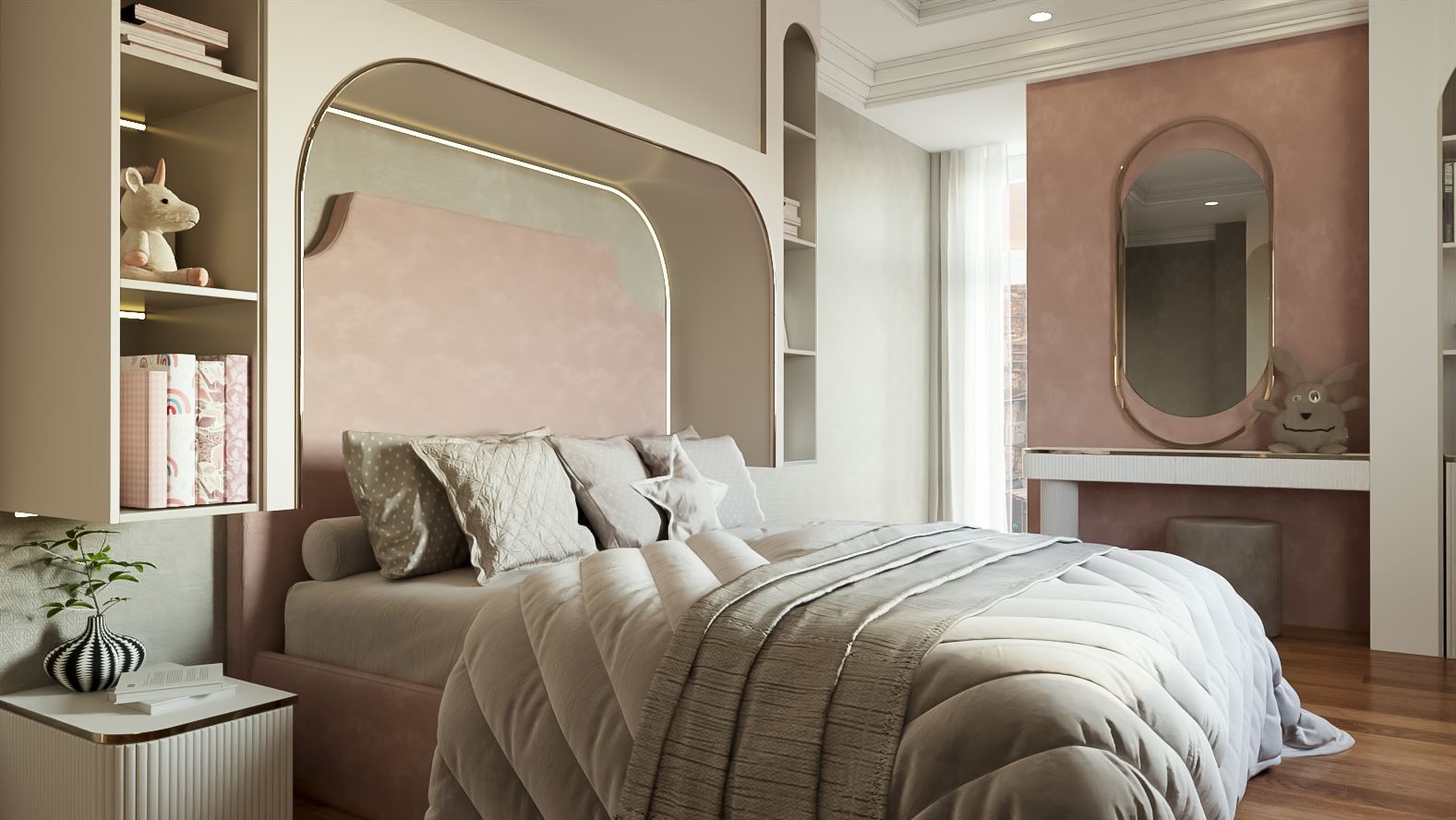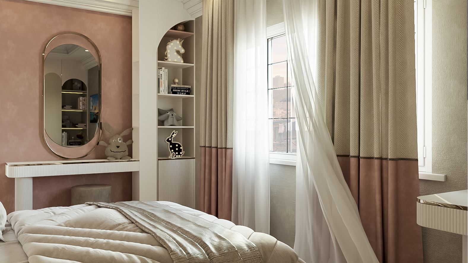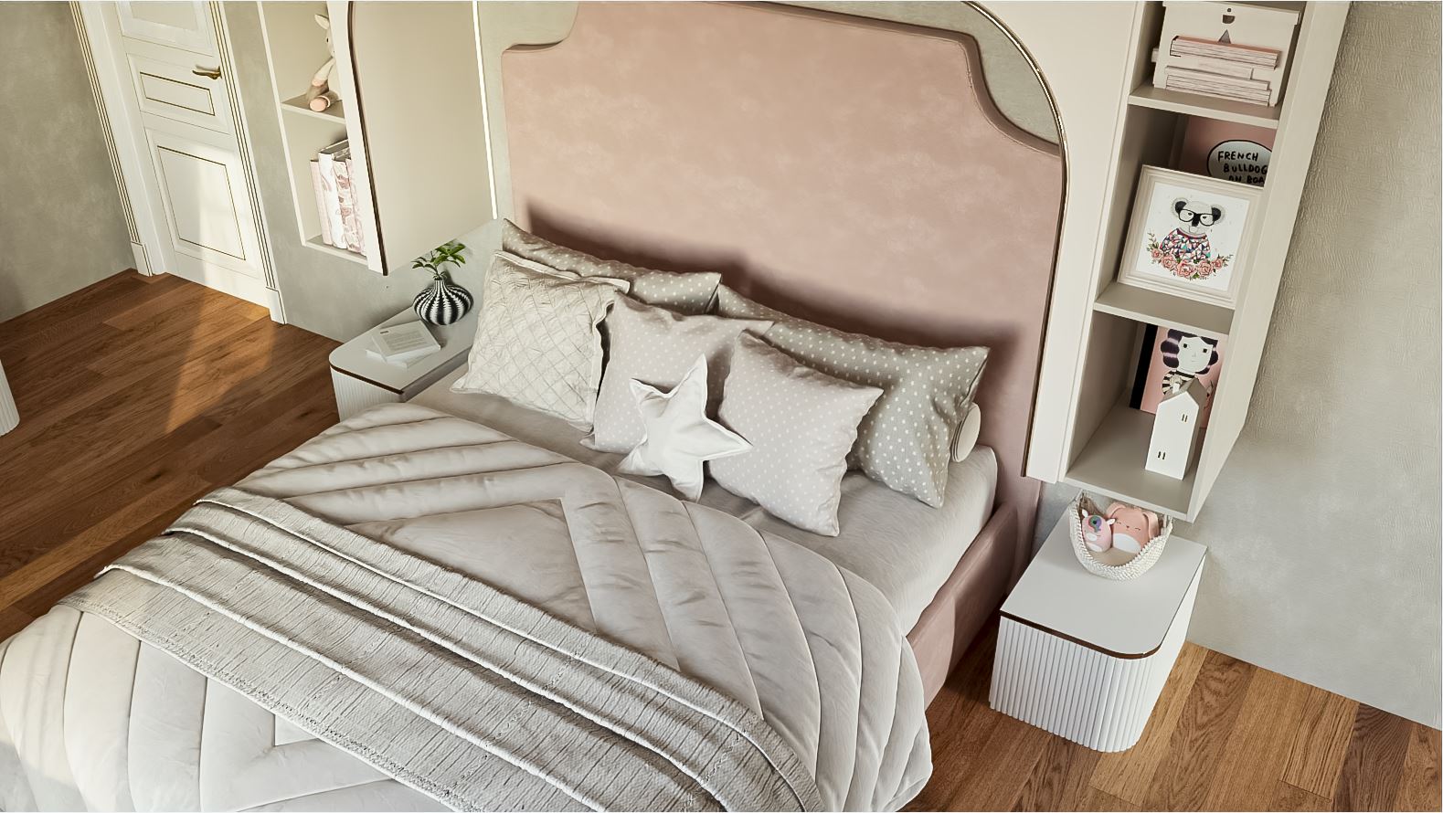 Otağın illər keçdikcə də zövqlü və aktual qalması üçün çəhrayı rəngi əsasən detallarda — pərdələrdə və aksesuarlarda tətbiq etdik. Zaten yataq və divar elementlərində bu rəng mövcuddur. Buna görə də ümumi interyer pastel tonlar üzərində quruldu.