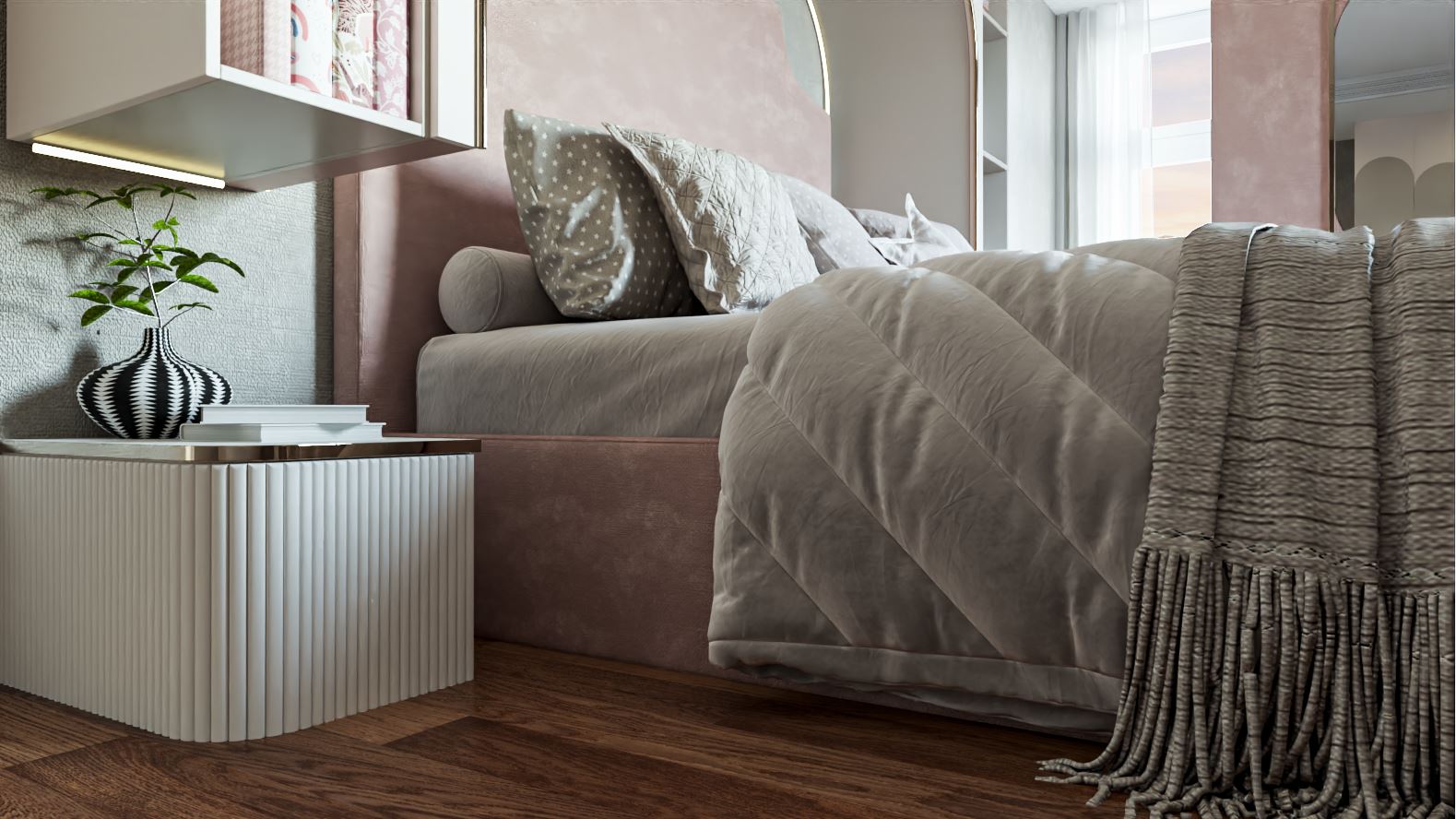 Otağın illər keçdikcə də zövqlü və aktual qalması üçün çəhrayı rəngi əsasən detallarda — pərdələrdə və aksesuarlarda tətbiq etdik. Zaten yataq və divar elementlərində bu rəng mövcuddur. Buna görə də ümumi interyer pastel tonlar üzərində quruldu.